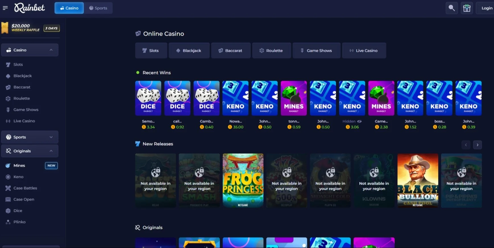 Rainbet ofrece más de 4,000 juegos de más de 40 proveedores de software líderes, incluyendo Pragmatic Play, Evolution, BGaming, Play’n GO y NetEnt. Categorías Populares de Juegos: